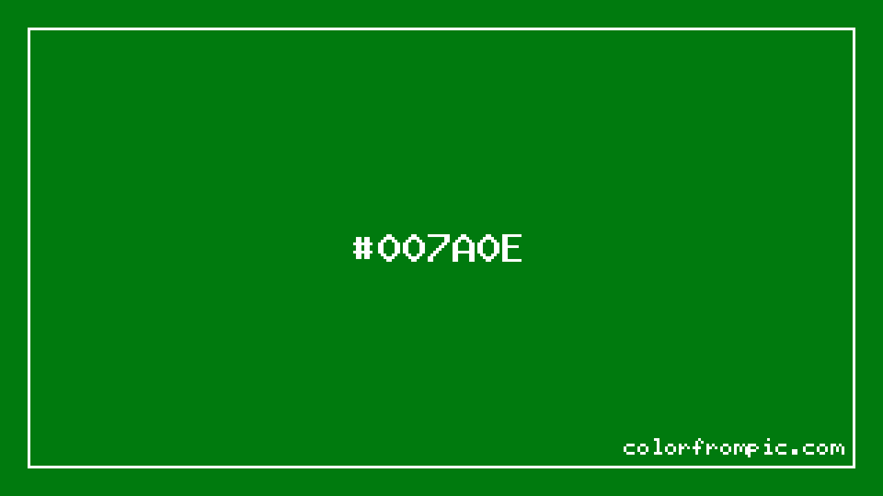 The HEX code for Deep Vivid Emerald is #007A0E. In CSS you can use it directly as color: #007A0E; or as a background: background-color: #007A0E;. The three-character shorthand is not available for this color since it cannot be reduced without changing the value. Use the full six-character hex for accurate reproduction in any web or design project.