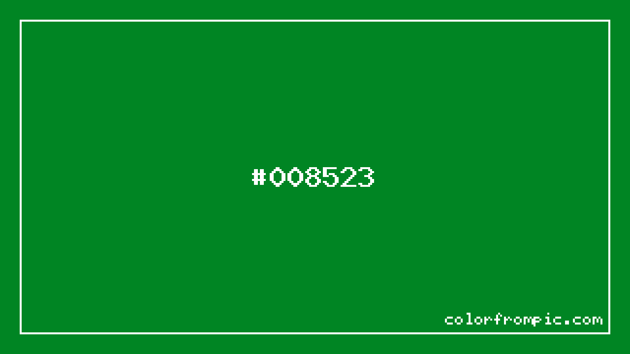 For print applications using the CMYK color model, #008523 would be reproduced using 100% cyan, 0% magenta, 74% yellow, and 48% black. The closest web-safe color is #009933, which may be useful for ensuring compatibility across older displays and systems.