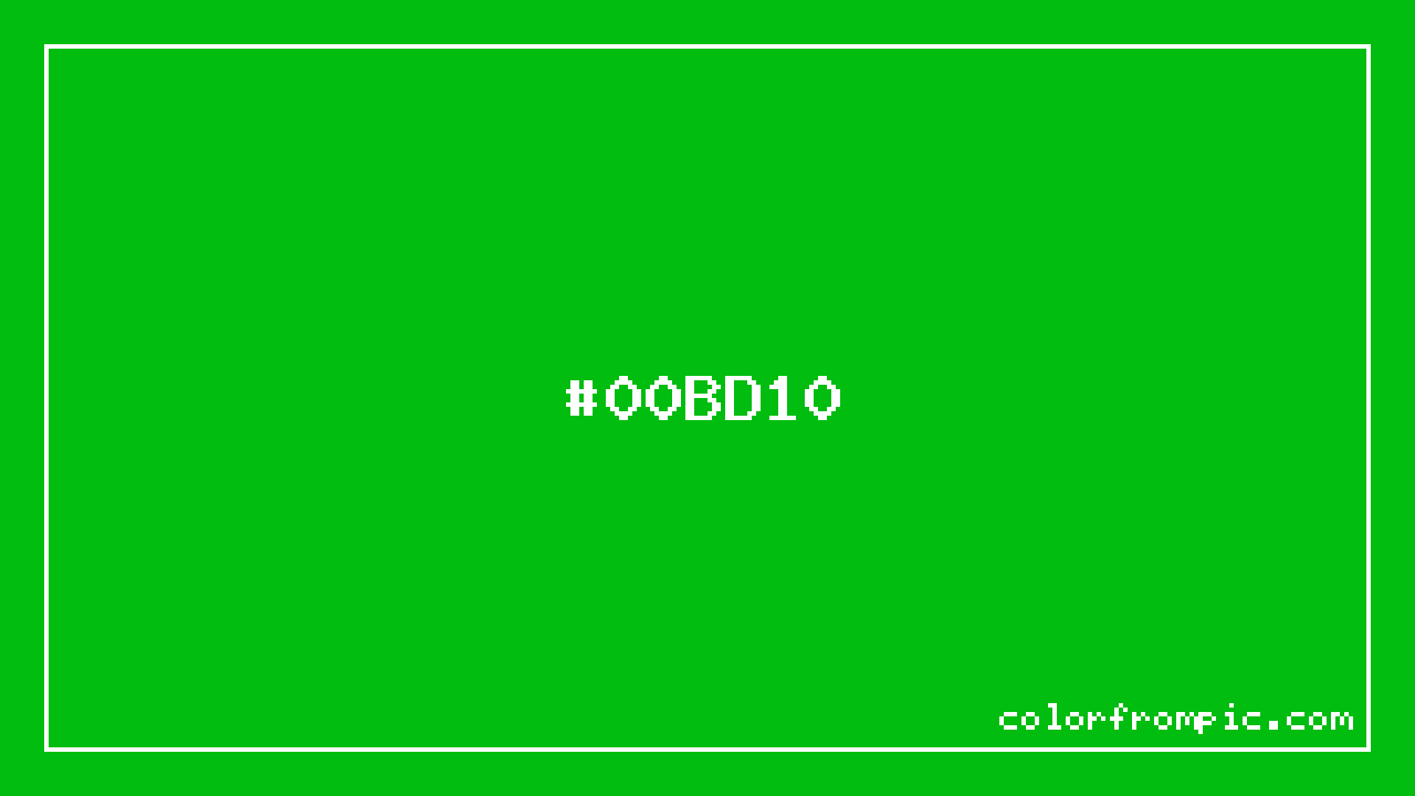 The hexadecimal color code #00BD10 represents a dark shade in the green family. In the RGB color model, this color is composed of 0 red, 189 green, and 16 blue, which translates to approximately 0% red, 74% green, and 6% blue. This makes it a highly saturated color with cool undertones that can evoke different emotional responses depending on its application.