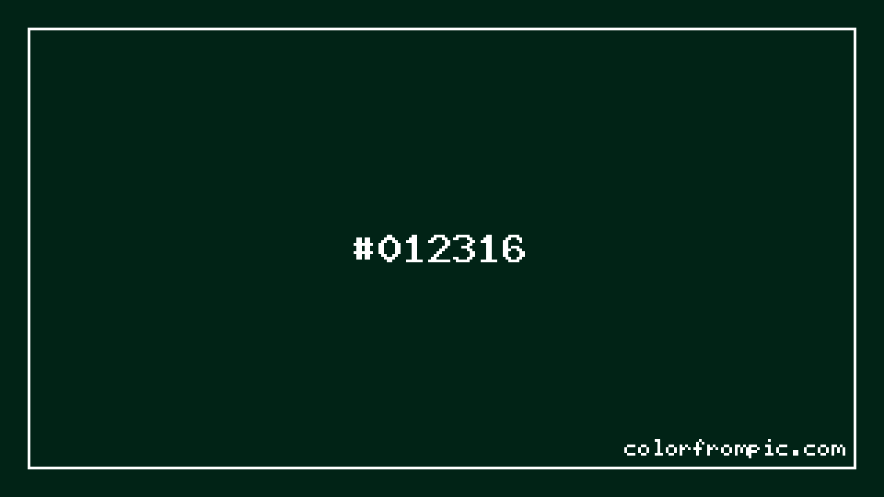 The HEX code for Deep Vivid Teal is #012316. In CSS you can use it directly as color: #012316; or as a background: background-color: #012316;. The three-character shorthand is not available for this color since it cannot be reduced without changing the value. Use the full six-character hex for accurate reproduction in any web or design project.