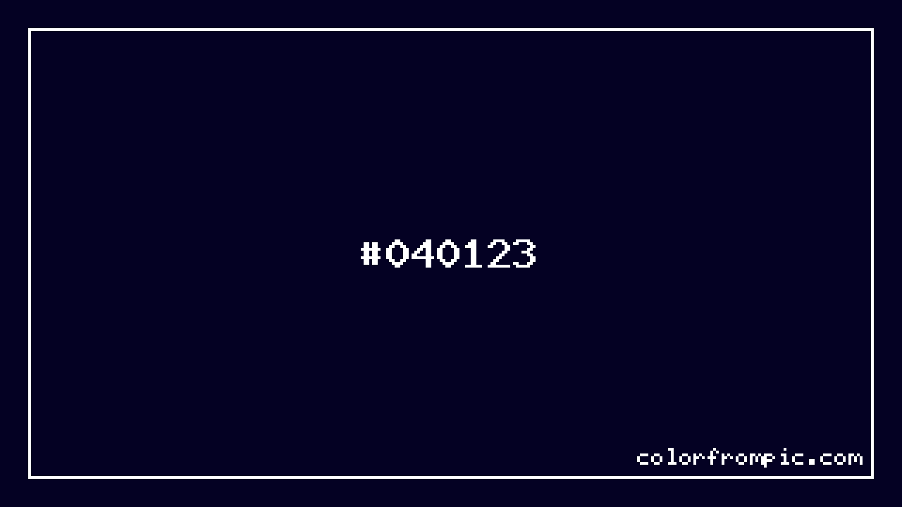 The hexadecimal color code #040123 represents a very dark shade in the blue family. In the RGB color model, this color is composed of 4 red, 1 green, and 35 blue, which translates to approximately 2% red, 0% green, and 14% blue. This makes it a highly saturated color with cool undertones that can evoke different emotional responses depending on its application.