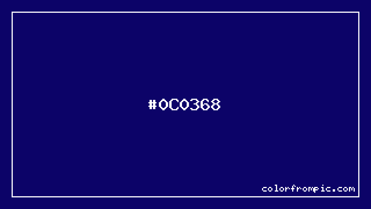 The hexadecimal color code #0C0368 represents a dark shade in the blue family. In the RGB color model, this color is composed of 12 red, 3 green, and 104 blue, which translates to approximately 5% red, 1% green, and 41% blue. This makes it a highly saturated color with cool undertones that can evoke different emotional responses depending on its application.