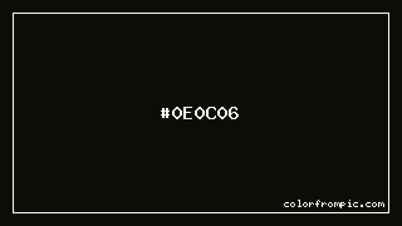 The hexadecimal color code #0E0C06 represents a very dark shade in the orange family. In the RGB color model, this color is composed of 14 red, 12 green, and 6 blue, which translates to approximately 5% red, 5% green, and 2% blue. This makes it a slightly desaturated color with warm undertones that can evoke different emotional responses depending on its application.