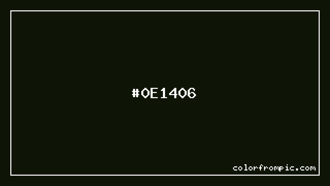 The hexadecimal color code #0E1406 represents a very dark shade in the yellow family. In the RGB color model, this color is composed of 14 red, 20 green, and 6 blue, which translates to approximately 5% red, 8% green, and 2% blue. This makes it a moderately saturated color with cool undertones that can evoke different emotional responses depending on its application.