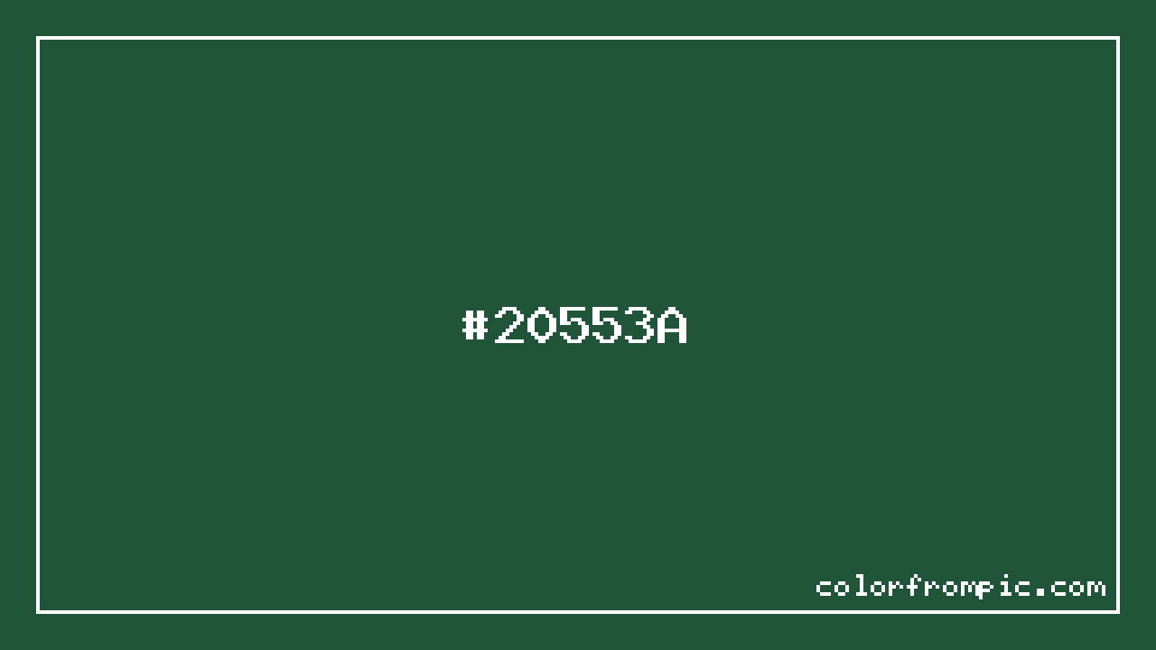 The hexadecimal color code #20553A represents a dark shade in the green family. In the RGB color model, this color is composed of 32 red, 85 green, and 58 blue, which translates to approximately 13% red, 33% green, and 23% blue. This makes it a slightly desaturated color with cool undertones that can evoke different emotional responses depending on its application.