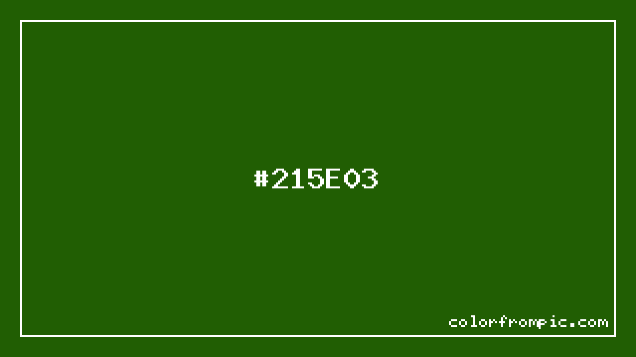 The hexadecimal color code #215E03 represents a very dark shade in the green family. In the RGB color model, this color is composed of 33 red, 94 green, and 3 blue, which translates to approximately 13% red, 37% green, and 1% blue. This makes it a highly saturated color with cool undertones that can evoke different emotional responses depending on its application.