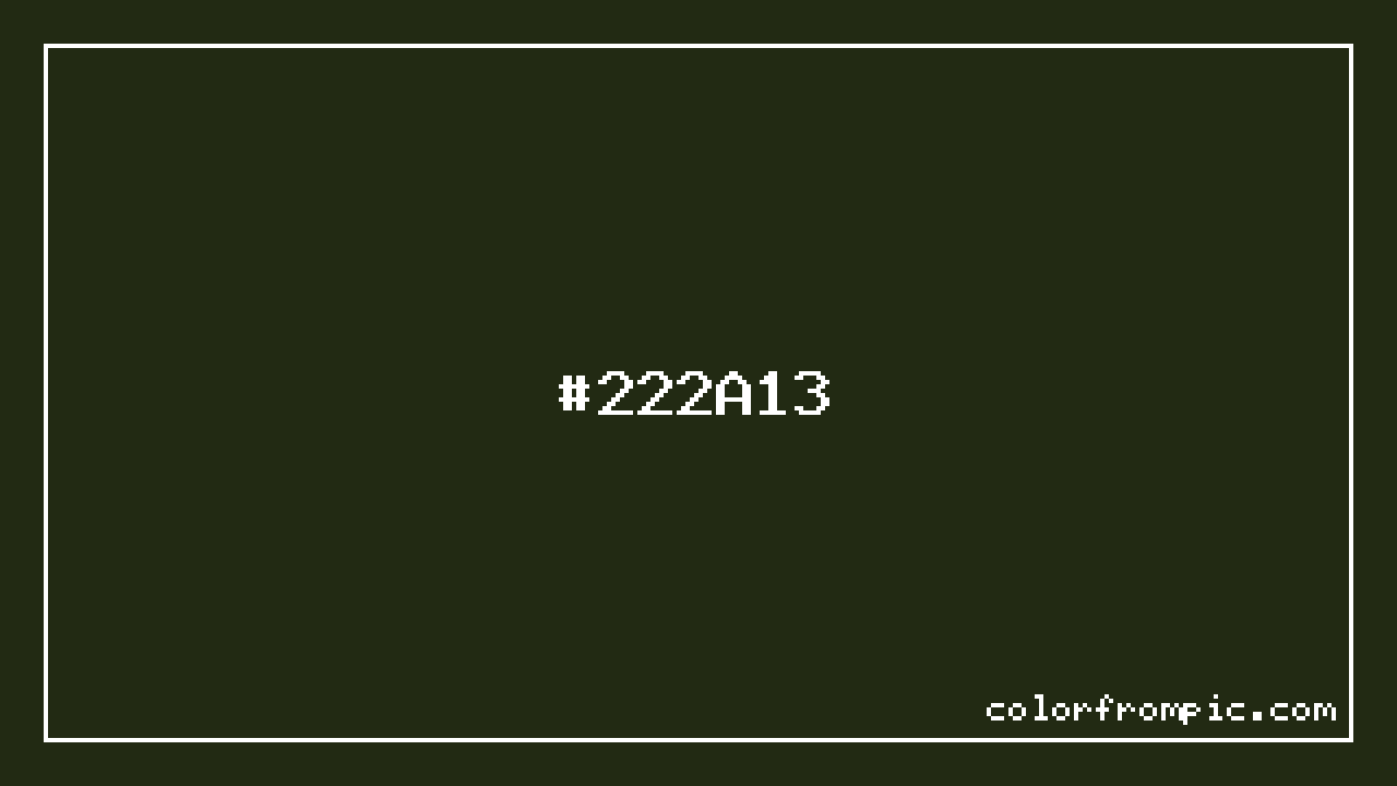 For print applications using the CMYK color model, #222A13 would be reproduced using 19% cyan, 0% magenta, 55% yellow, and 84% black. The closest web-safe color is #333300, which may be useful for ensuring compatibility across older displays and systems.