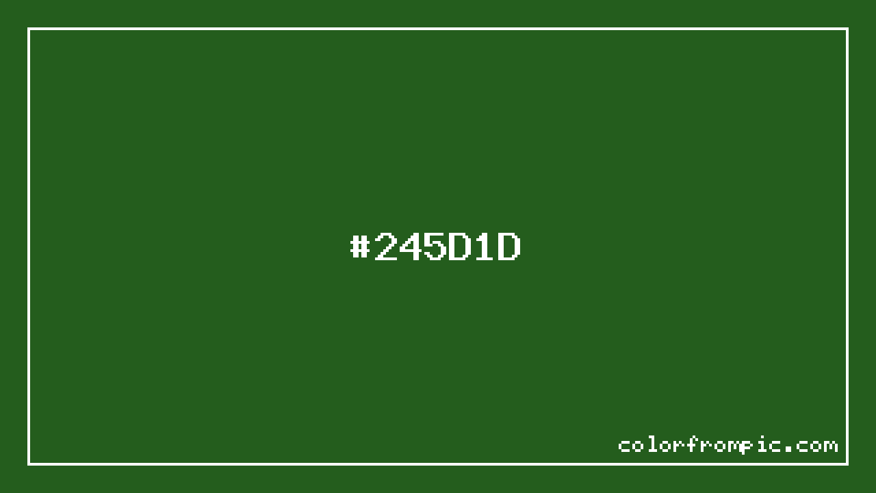 The hexadecimal color code #245D1D represents a dark shade in the green family. In the RGB color model, this color is composed of 36 red, 93 green, and 29 blue, which translates to approximately 14% red, 36% green, and 11% blue. This makes it a moderately saturated color with cool undertones that can evoke different emotional responses depending on its application.