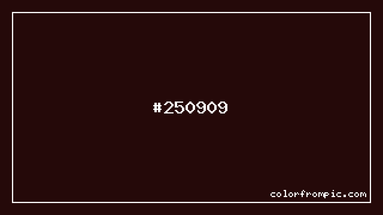 The hexadecimal color code #250909 represents a very dark shade in the red family. In the RGB color model, this color is composed of 37 red, 9 green, and 9 blue, which translates to approximately 15% red, 4% green, and 4% blue. This makes it a moderately saturated color with warm undertones that can evoke different emotional responses depending on its application.