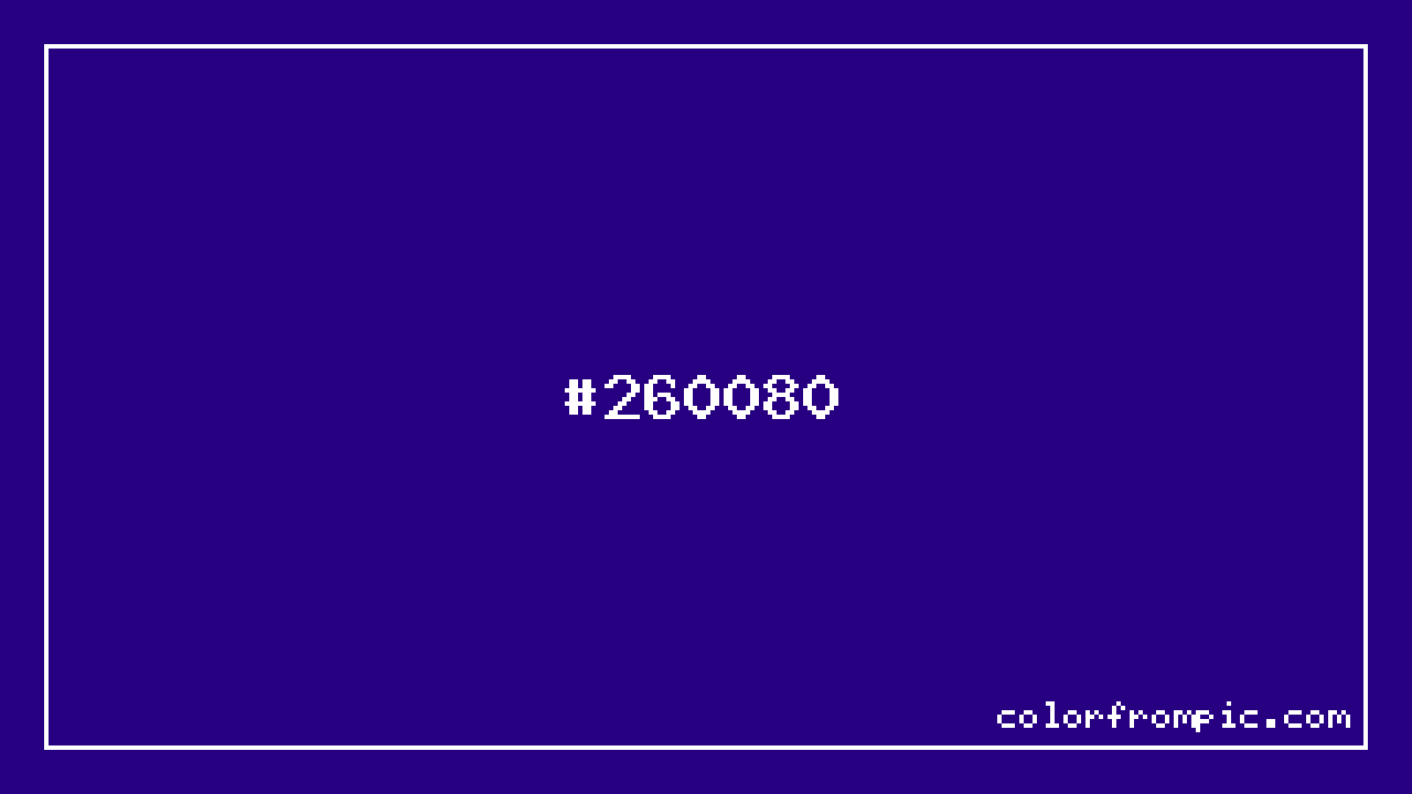 The HEX code for Deep Vivid Violet is #260080. In CSS you can use it directly as color: #260080; or as a background: background-color: #260080;. The three-character shorthand is not available for this color since it cannot be reduced without changing the value. Use the full six-character hex for accurate reproduction in any web or design project.