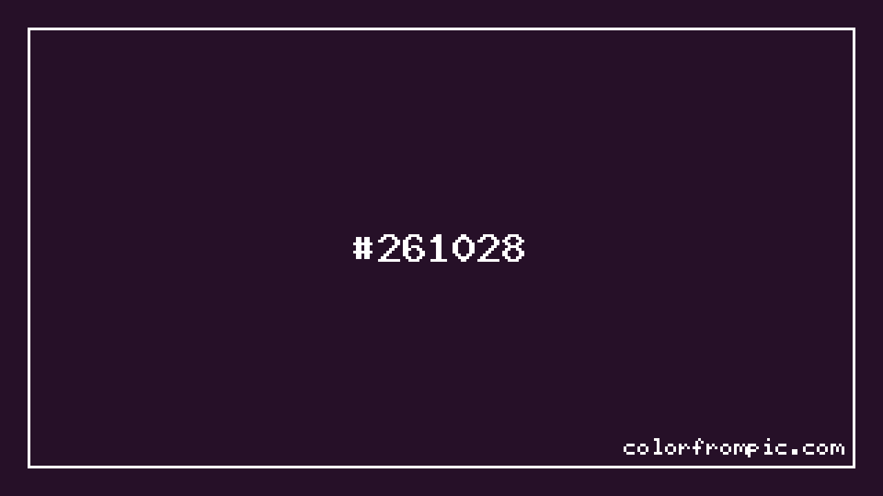The hexadecimal color code #261028 represents a very dark shade in the purple family. In the RGB color model, this color is composed of 38 red, 16 green, and 40 blue, which translates to approximately 15% red, 6% green, and 16% blue. This makes it a slightly desaturated color with cool undertones that can evoke different emotional responses depending on its application.
