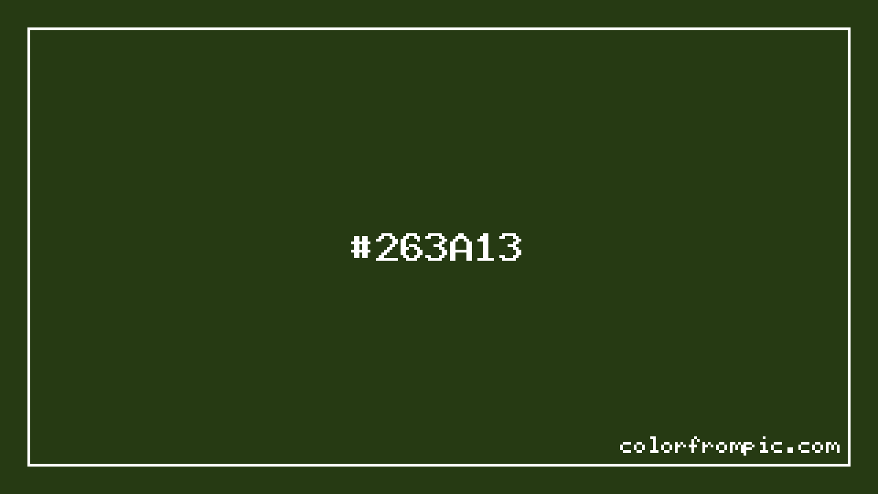 The hexadecimal color code #263A13 represents a very dark shade in the green family. In the RGB color model, this color is composed of 38 red, 58 green, and 19 blue, which translates to approximately 15% red, 23% green, and 7% blue. This makes it a moderately saturated color with cool undertones that can evoke different emotional responses depending on its application.