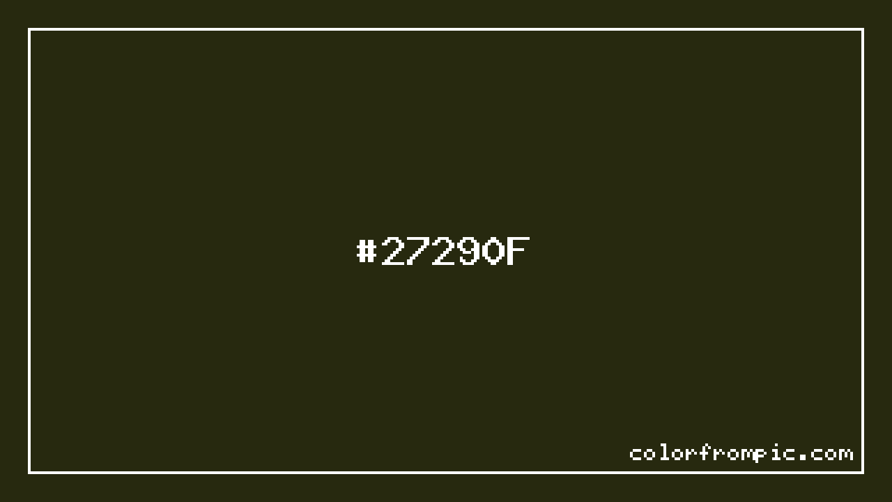 The RGB value of #27290F is rgb(39, 41, 15). This means the color contains 39 out of 255 parts red, 41 out of 255 parts green, and 15 out of 255 parts blue. Red is the weakest (with blue dominant) channel in this color mix. You can use the full RGB function in any CSS property: color: rgb(39, 41, 15);