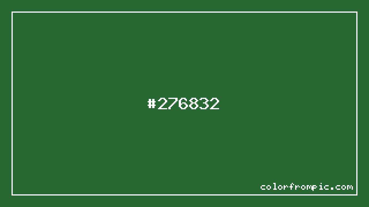 The hexadecimal color code #276832 represents a dark shade in the green family. In the RGB color model, this color is composed of 39 red, 104 green, and 50 blue, which translates to approximately 15% red, 41% green, and 20% blue. This makes it a slightly desaturated color with cool undertones that can evoke different emotional responses depending on its application.