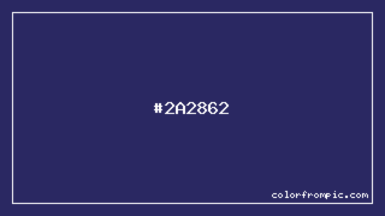 The hexadecimal color code #2A2862 represents a dark shade in the blue family. In the RGB color model, this color is composed of 42 red, 40 green, and 98 blue, which translates to approximately 16% red, 16% green, and 38% blue. This makes it a slightly desaturated color with cool undertones that can evoke different emotional responses depending on its application.