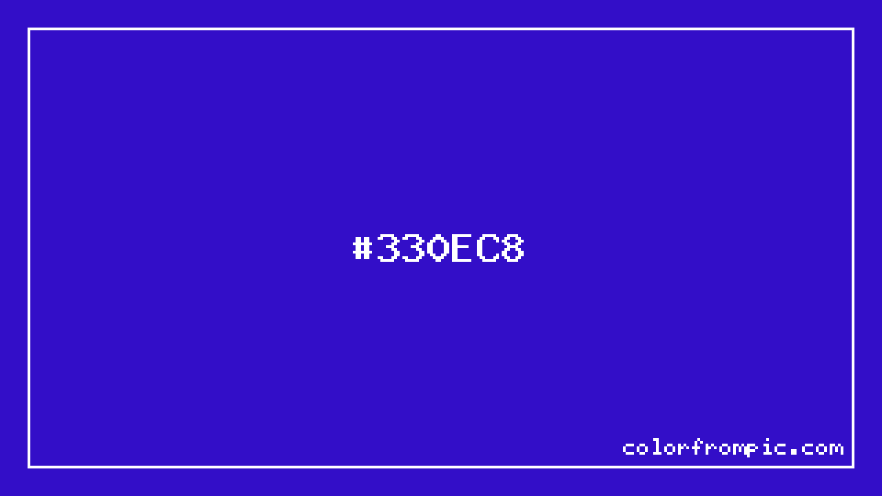 The HEX code for Vivid Violet is #330EC8. In CSS you can use it directly as color: #330EC8; or as a background: background-color: #330EC8;. The three-character shorthand is not available for this color since it cannot be reduced without changing the value. Use the full six-character hex for accurate reproduction in any web or design project.
