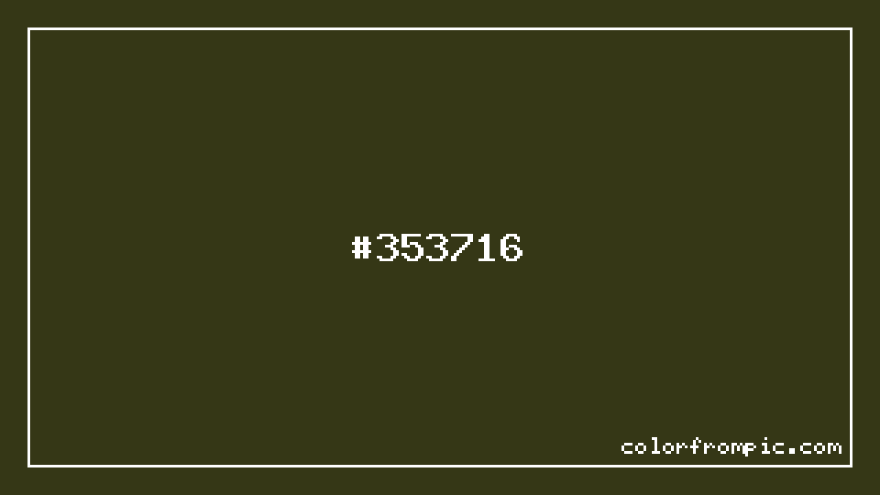 For print applications using the CMYK color model, #353716 would be reproduced using 4% cyan, 0% magenta, 60% yellow, and 78% black. The closest web-safe color is #333300, which may be useful for ensuring compatibility across older displays and systems.