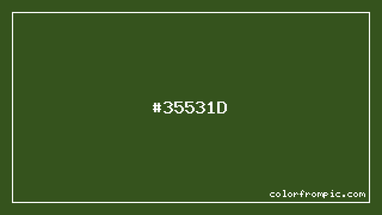 The hexadecimal color code #35531D represents a dark shade in the green family. In the RGB color model, this color is composed of 53 red, 83 green, and 29 blue, which translates to approximately 21% red, 33% green, and 11% blue. This makes it a slightly desaturated color with cool undertones that can evoke different emotional responses depending on its application.