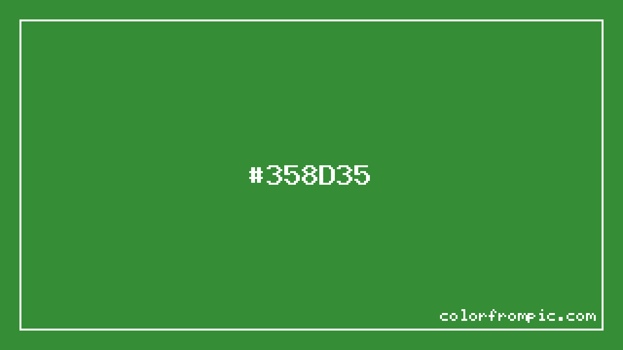 The HEX code for Dark Emerald is #358D35. In CSS you can use it directly as color: #358D35; or as a background: background-color: #358D35;. The three-character shorthand is not available for this color since it cannot be reduced without changing the value. Use the full six-character hex for accurate reproduction in any web or design project.