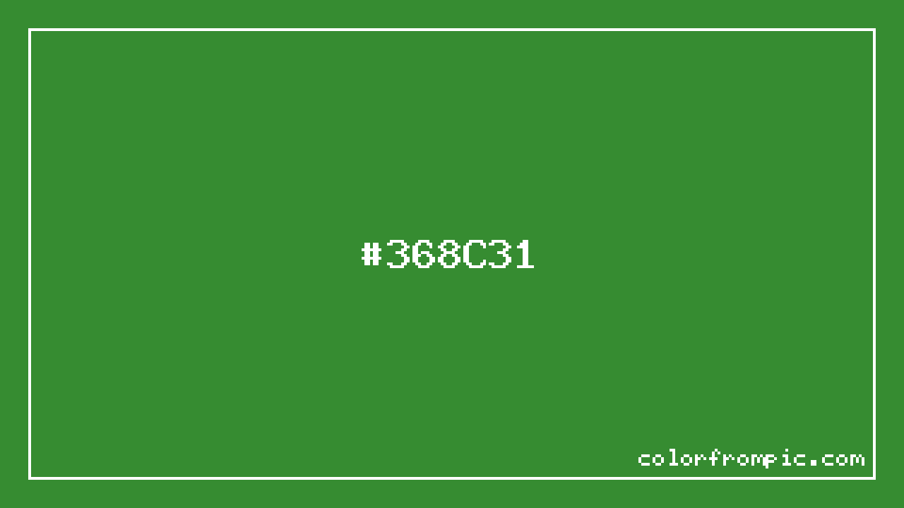 The HEX code for Dark Green is #368C31. In CSS you can use it directly as color: #368C31; or as a background: background-color: #368C31;. The three-character shorthand is not available for this color since it cannot be reduced without changing the value. Use the full six-character hex for accurate reproduction in any web or design project.