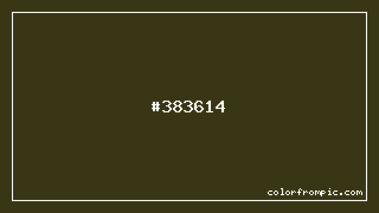 For print applications using the CMYK color model, #383614 would be reproduced using 0% cyan, 4% magenta, 64% yellow, and 78% black. The closest web-safe color is #333300, which may be useful for ensuring compatibility across older displays and systems.