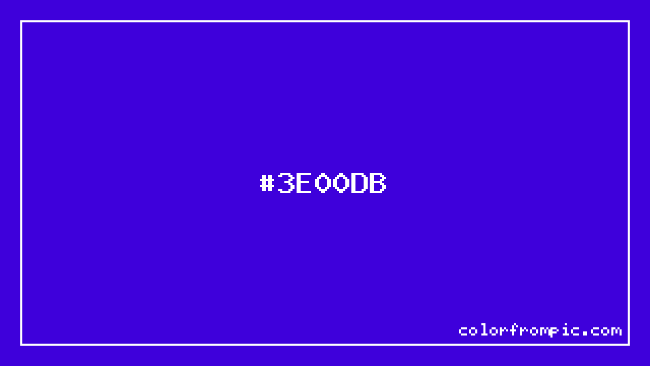 The HEX code for Vivid Violet is #3E00DB. In CSS you can use it directly as color: #3E00DB; or as a background: background-color: #3E00DB;. The three-character shorthand is not available for this color since it cannot be reduced without changing the value. Use the full six-character hex for accurate reproduction in any web or design project.