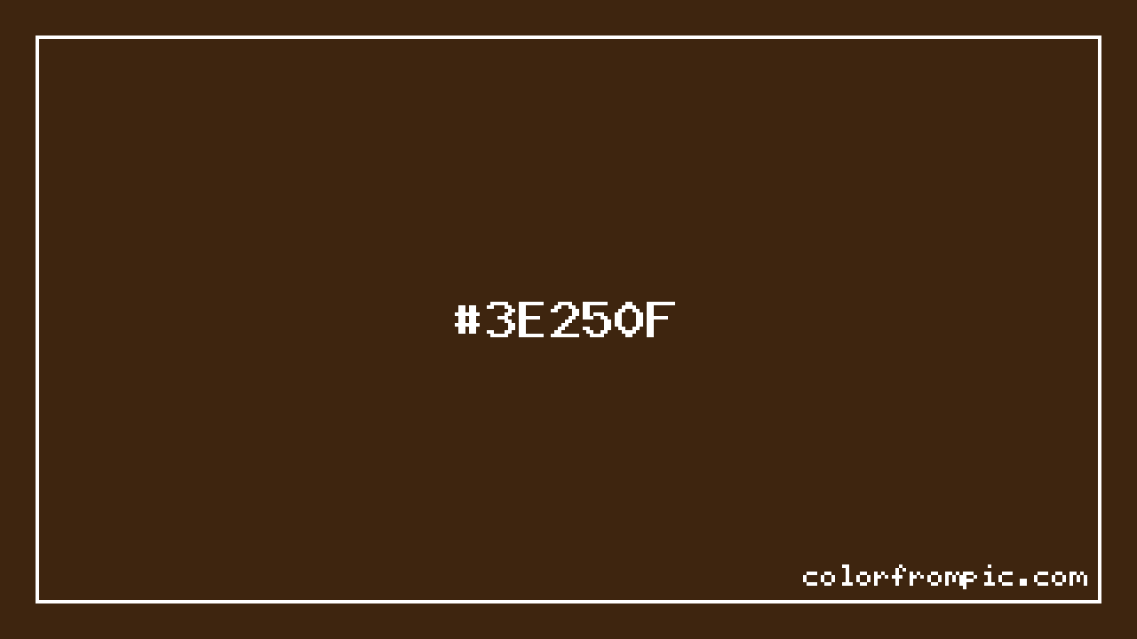 The hexadecimal color code #3E250F represents a very dark shade in the red family. In the RGB color model, this color is composed of 62 red, 37 green, and 15 blue, which translates to approximately 24% red, 15% green, and 6% blue. This makes it a moderately saturated color with warm undertones that can evoke different emotional responses depending on its application.