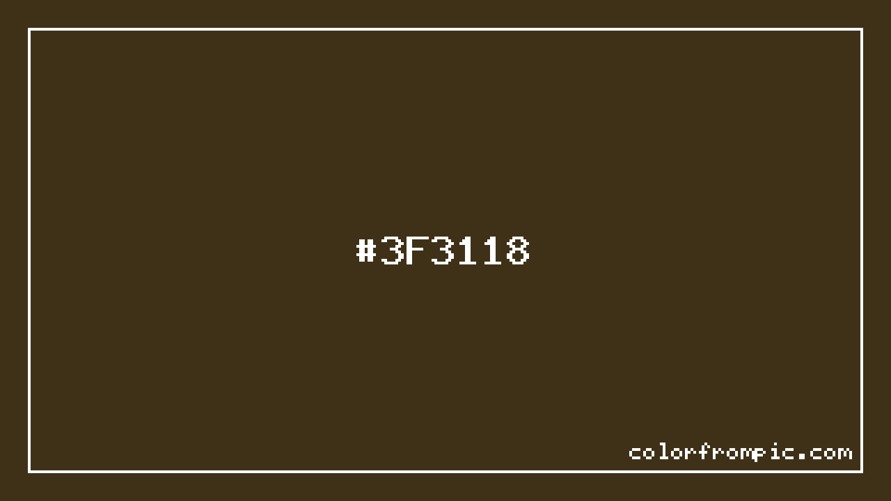 The hexadecimal color code #3F3118 represents a very dark shade in the orange family. In the RGB color model, this color is composed of 63 red, 49 green, and 24 blue, which translates to approximately 25% red, 19% green, and 9% blue. This makes it a slightly desaturated color with warm undertones that can evoke different emotional responses depending on its application.