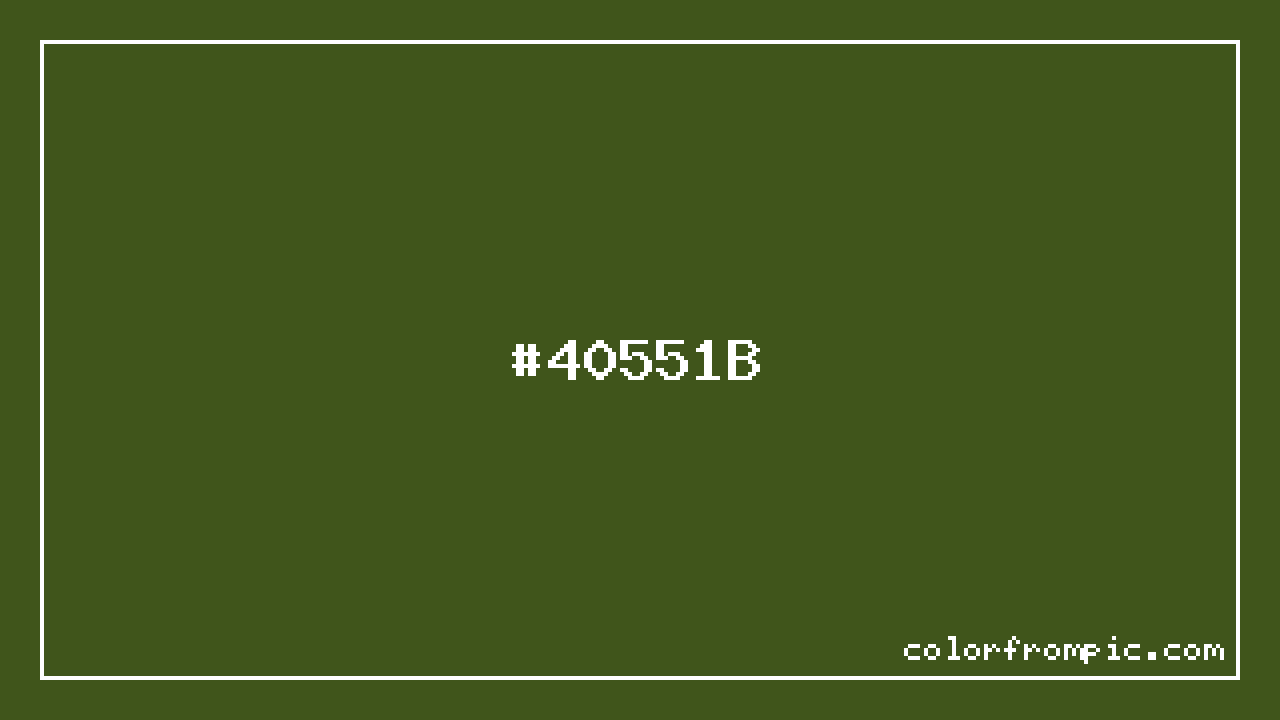 The hexadecimal color code #40551B represents a dark shade in the yellow family. In the RGB color model, this color is composed of 64 red, 85 green, and 27 blue, which translates to approximately 25% red, 33% green, and 11% blue. This makes it a moderately saturated color with cool undertones that can evoke different emotional responses depending on its application.