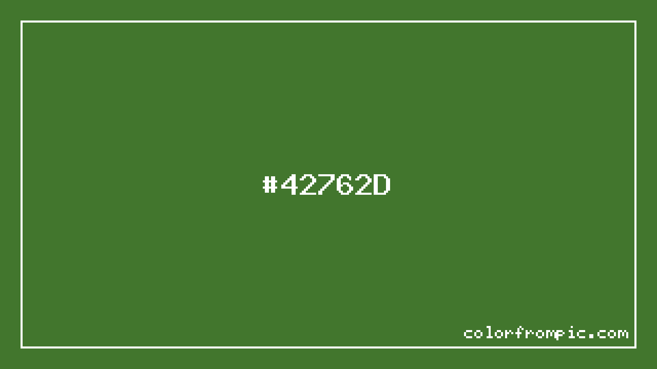 The HEX code for Dark Green is #42762D. In CSS you can use it directly as color: #42762D; or as a background: background-color: #42762D;. The three-character shorthand is not available for this color since it cannot be reduced without changing the value. Use the full six-character hex for accurate reproduction in any web or design project.
