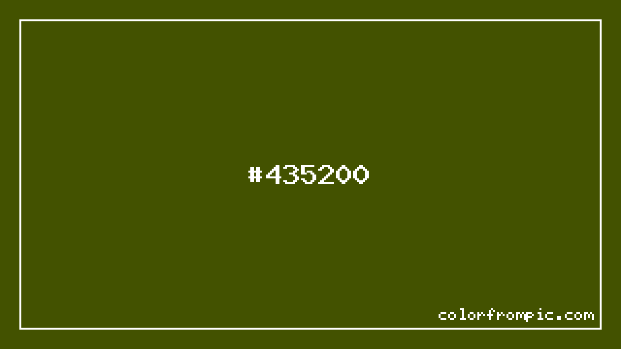 For print applications using the CMYK color model, #435200 would be reproduced using 18% cyan, 0% magenta, 100% yellow, and 68% black. The closest web-safe color is #336600, which may be useful for ensuring compatibility across older displays and systems.