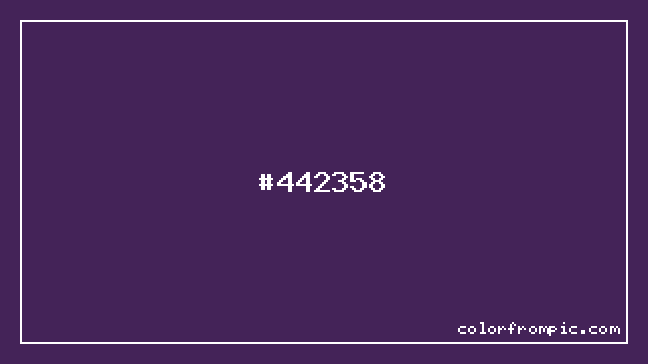 The HEX code for Deep Violet is #442358. In CSS you can use it directly as color: #442358; or as a background: background-color: #442358;. The three-character shorthand is not available for this color since it cannot be reduced without changing the value. Use the full six-character hex for accurate reproduction in any web or design project.