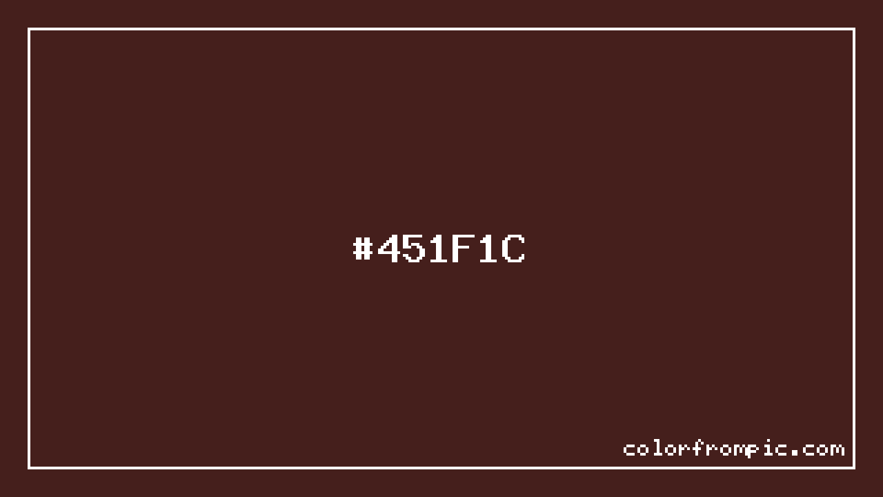 The hexadecimal color code #451F1C represents a very dark shade in the red family. In the RGB color model, this color is composed of 69 red, 31 green, and 28 blue, which translates to approximately 27% red, 12% green, and 11% blue. This makes it a slightly desaturated color with warm undertones that can evoke different emotional responses depending on its application.