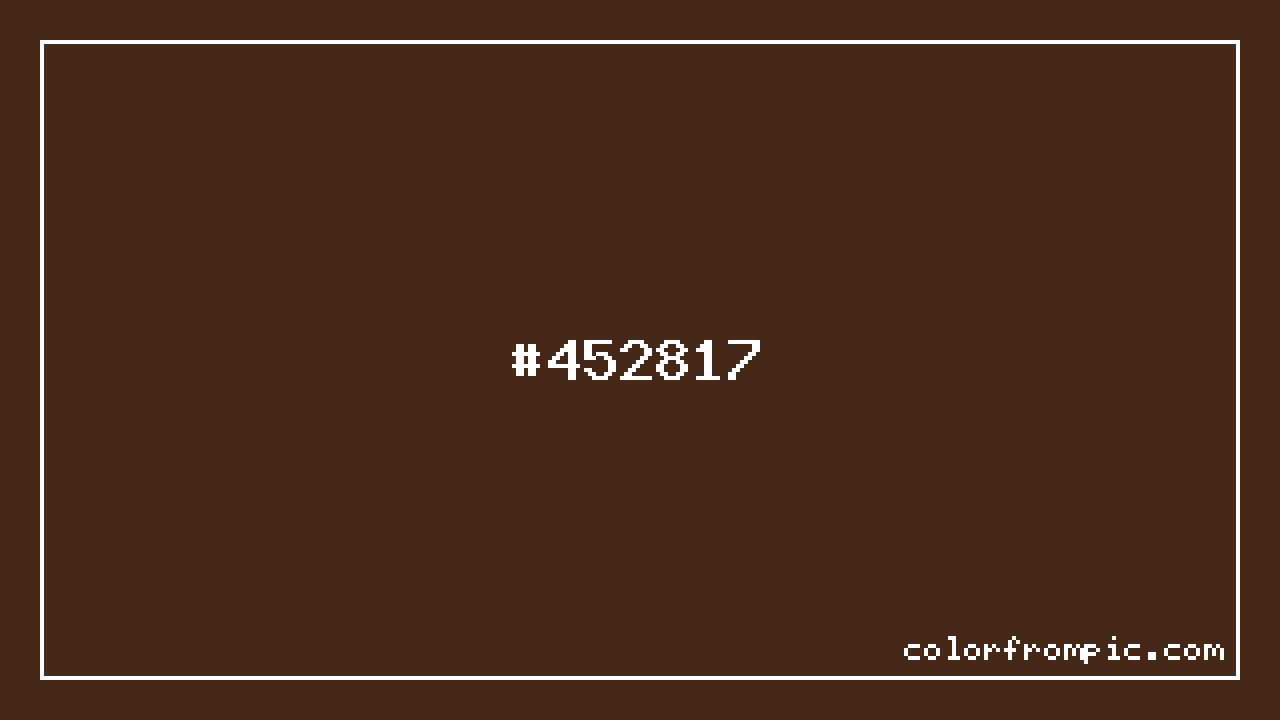 The hexadecimal color code #452817 represents a very dark shade in the red family. In the RGB color model, this color is composed of 69 red, 40 green, and 23 blue, which translates to approximately 27% red, 16% green, and 9% blue. This makes it a slightly desaturated color with warm undertones that can evoke different emotional responses depending on its application.