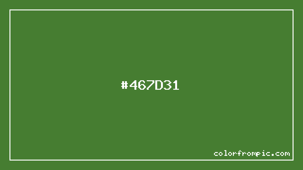 For print applications using the CMYK color model, #467D31 would be reproduced using 44% cyan, 0% magenta, 61% yellow, and 51% black. The closest web-safe color is #336633, which may be useful for ensuring compatibility across older displays and systems.