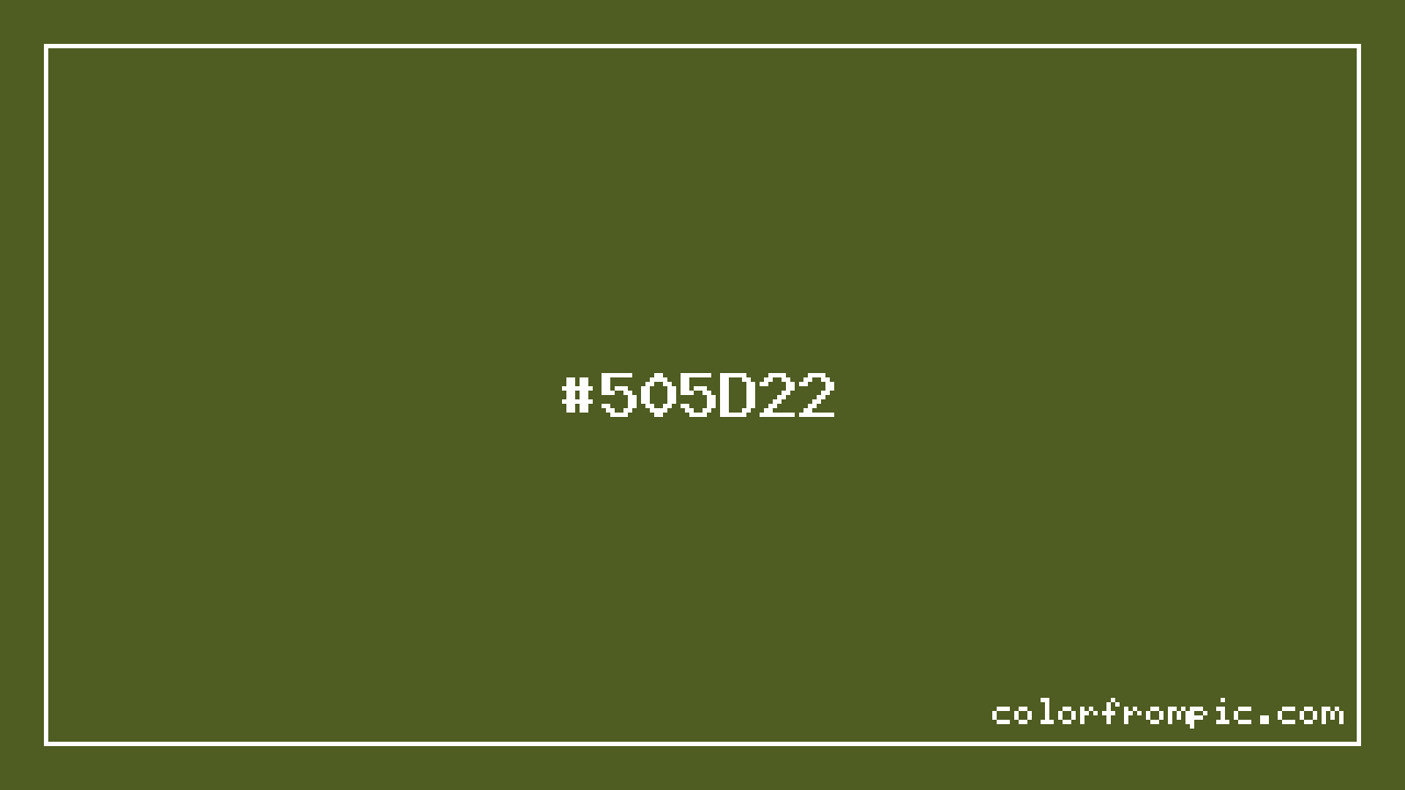 For print applications using the CMYK color model, #505D22 would be reproduced using 14% cyan, 0% magenta, 63% yellow, and 64% black. The closest web-safe color is #666633, which may be useful for ensuring compatibility across older displays and systems.