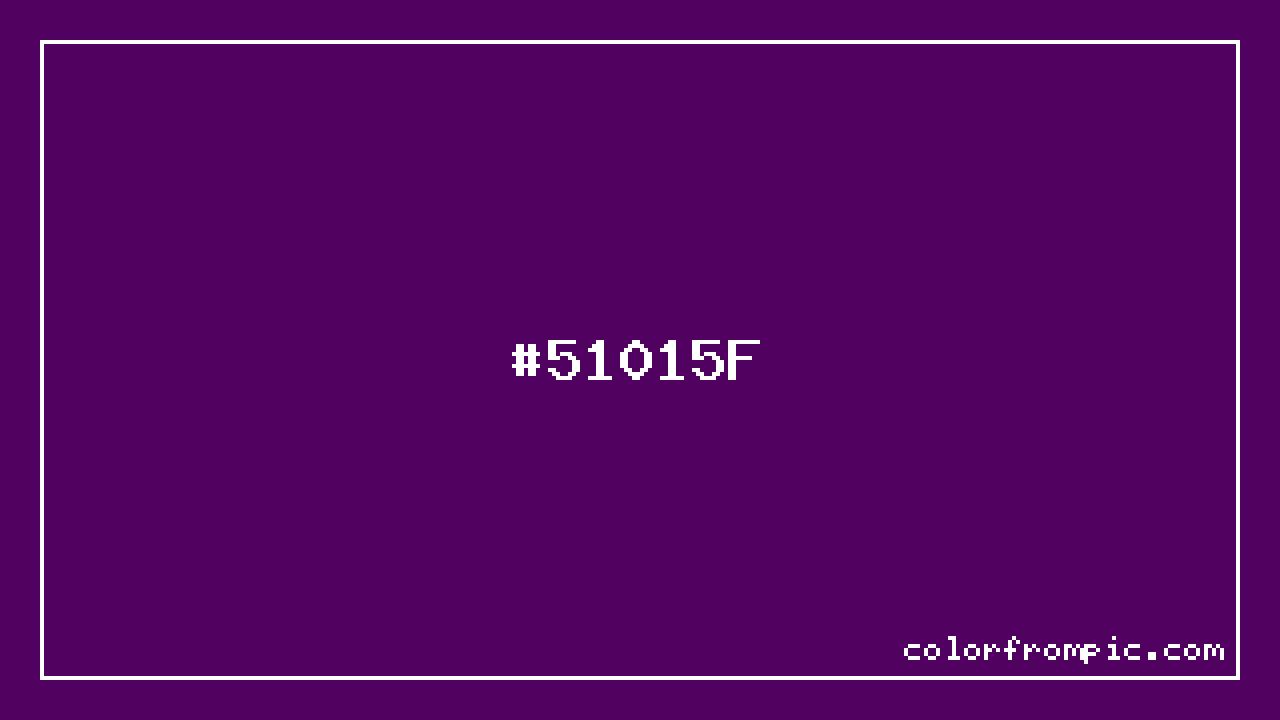 The HEX code for Deep Vivid Purple is #51015F. In CSS you can use it directly as color: #51015F; or as a background: background-color: #51015F;. The three-character shorthand is not available for this color since it cannot be reduced without changing the value. Use the full six-character hex for accurate reproduction in any web or design project.