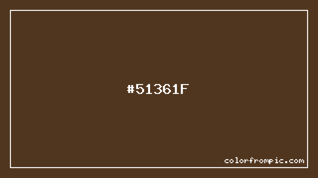 This color works well in various design contexts. As a darker shade, it works well for text, headers, and creating visual weight in compositions. The moderate to low saturation gives this color a sophisticated, muted quality that works well in professional and minimalist designs. When pairing #51361F with other colors, consider its complementary color at hue 208° for maximum contrast, or use analogous colors within 30° of its hue for harmonious combinations. The decimal representation of this color is 5322271, which can be useful in certain programming contexts.