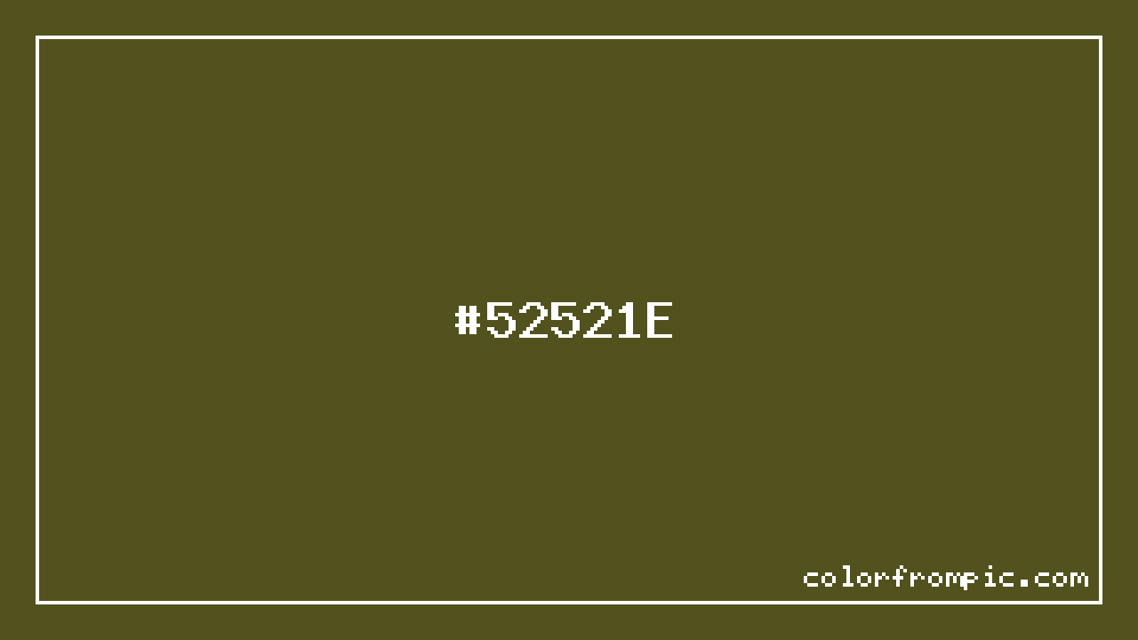 The hexadecimal color code #52521E represents a dark shade in the yellow family. In the RGB color model, this color is composed of 82 red, 82 green, and 30 blue, which translates to approximately 32% red, 32% green, and 12% blue. This makes it a slightly desaturated color with cool undertones that can evoke different emotional responses depending on its application.