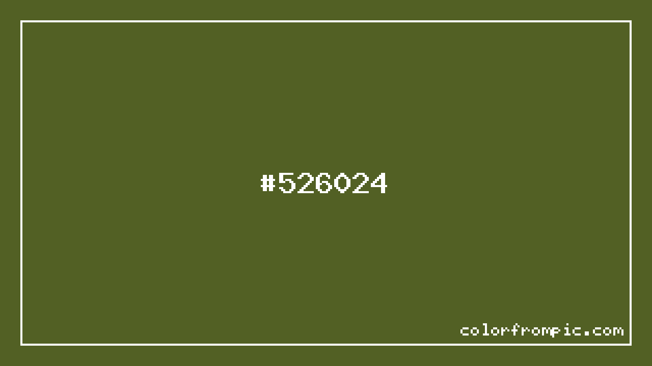 The hexadecimal color code #526024 represents a dark shade in the yellow family. In the RGB color model, this color is composed of 82 red, 96 green, and 36 blue, which translates to approximately 32% red, 38% green, and 14% blue. This makes it a slightly desaturated color with cool undertones that can evoke different emotional responses depending on its application.