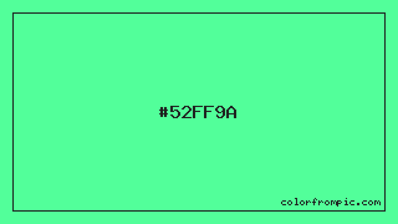 The hexadecimal color code #52FF9A represents a light shade in the green family. In the RGB color model, this color is composed of 82 red, 255 green, and 154 blue, which translates to approximately 32% red, 100% green, and 60% blue. This makes it a highly saturated color with cool undertones that can evoke different emotional responses depending on its application.