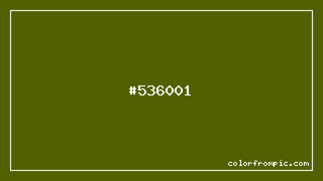 The hexadecimal color code #536001 represents a very dark shade in the yellow family. In the RGB color model, this color is composed of 83 red, 96 green, and 1 blue, which translates to approximately 33% red, 38% green, and 0% blue. This makes it a highly saturated color with cool undertones that can evoke different emotional responses depending on its application.