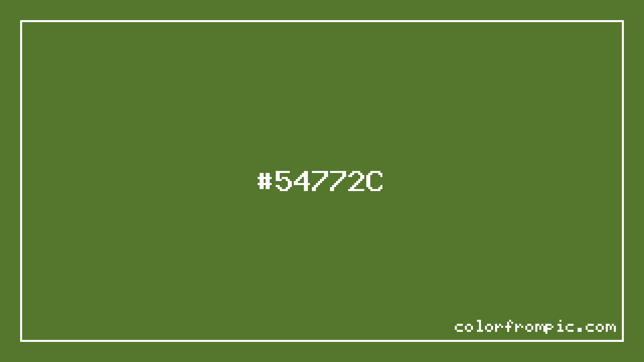 For print applications using the CMYK color model, #54772C would be reproduced using 29% cyan, 0% magenta, 63% yellow, and 53% black. The closest web-safe color is #666633, which may be useful for ensuring compatibility across older displays and systems.