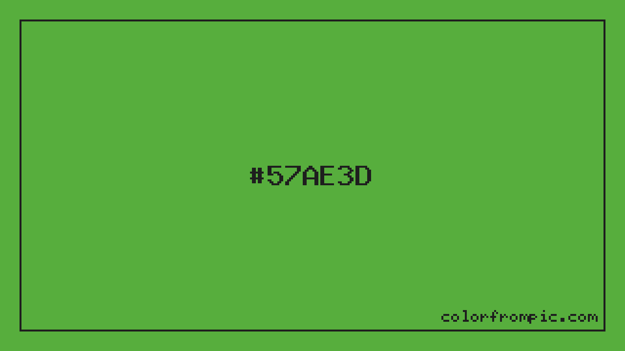 The HEX code for Green is #57AE3D. In CSS you can use it directly as color: #57AE3D; or as a background: background-color: #57AE3D;. The three-character shorthand is not available for this color since it cannot be reduced without changing the value. Use the full six-character hex for accurate reproduction in any web or design project.