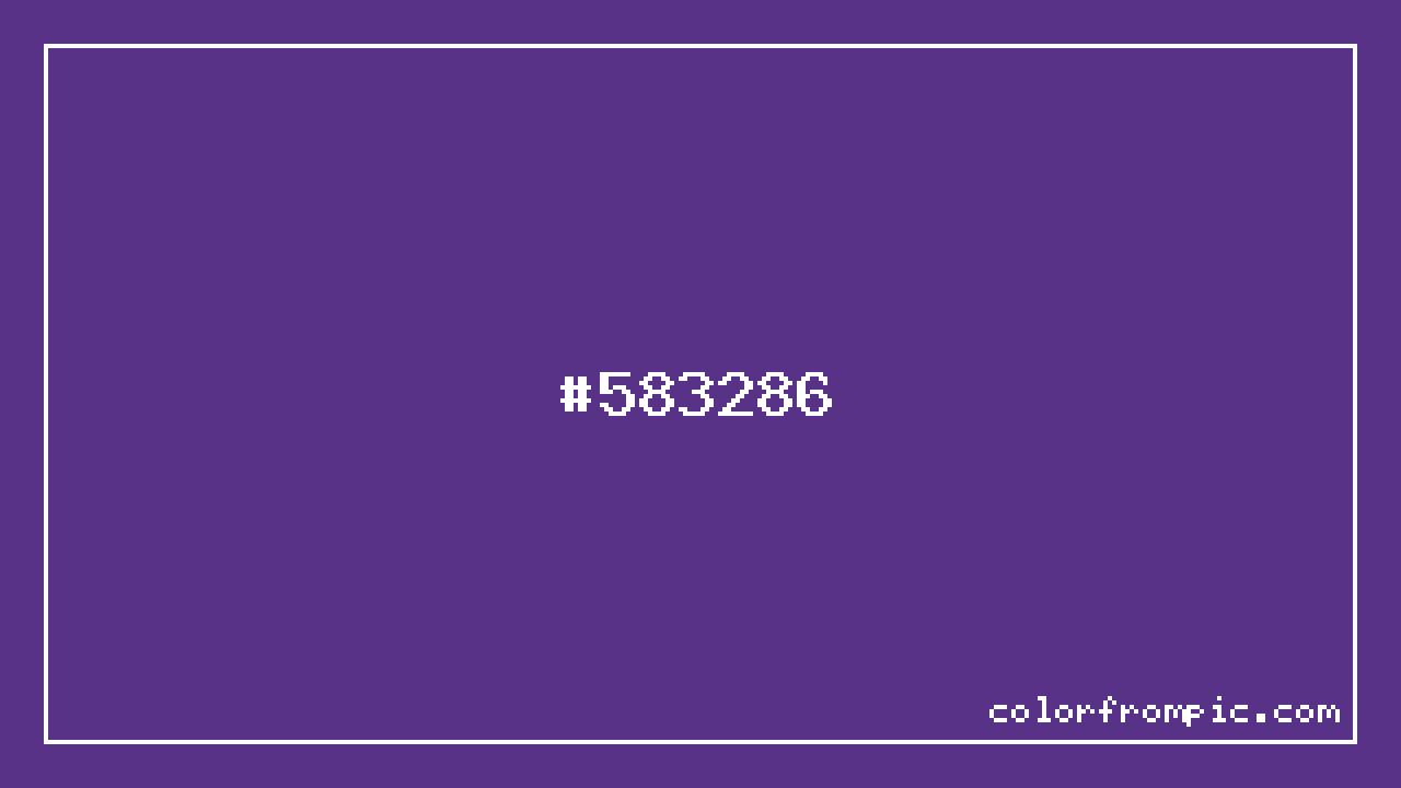 The HEX code for Dark Violet is #583286. In CSS you can use it directly as color: #583286; or as a background: background-color: #583286;. The three-character shorthand is not available for this color since it cannot be reduced without changing the value. Use the full six-character hex for accurate reproduction in any web or design project.