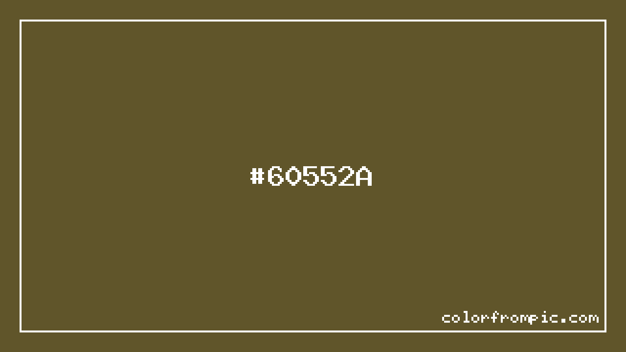 The hexadecimal color code #60552A represents a dark shade in the orange family. In the RGB color model, this color is composed of 96 red, 85 green, and 42 blue, which translates to approximately 38% red, 33% green, and 16% blue. This makes it a slightly desaturated color with warm undertones that can evoke different emotional responses depending on its application.
