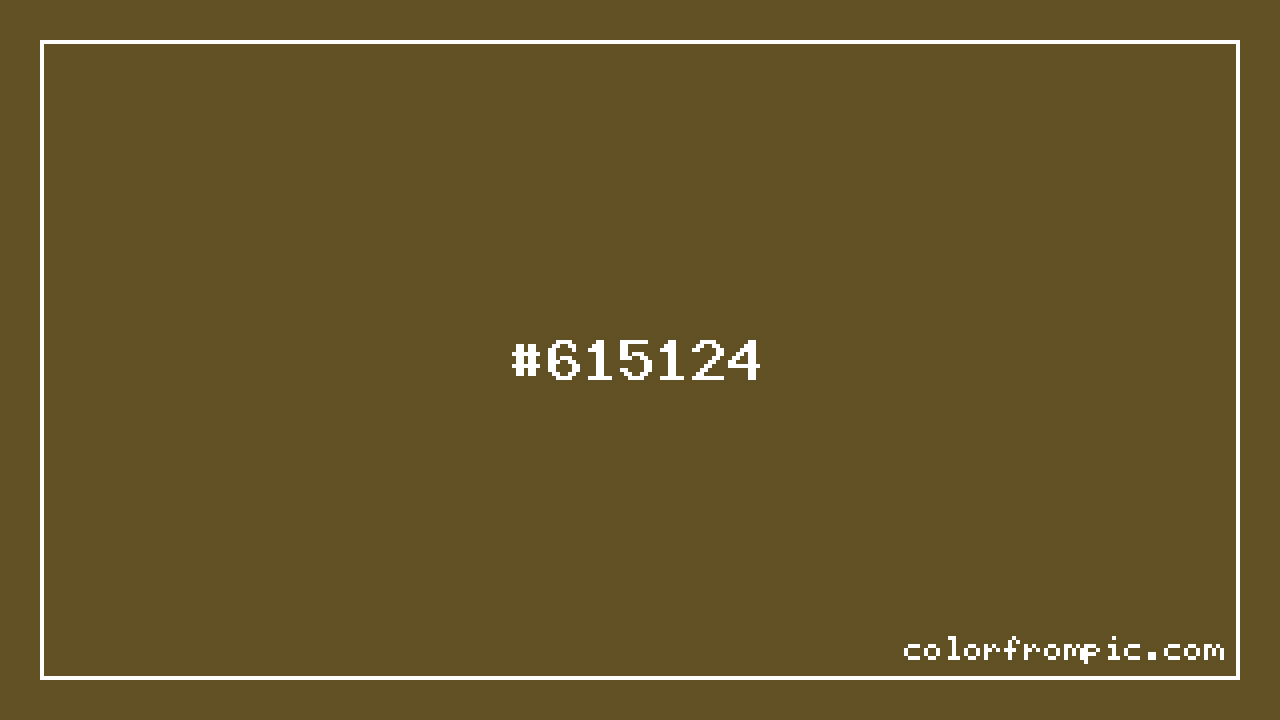 For print applications using the CMYK color model, #615124 would be reproduced using 0% cyan, 16% magenta, 63% yellow, and 62% black. The closest web-safe color is #666633, which may be useful for ensuring compatibility across older displays and systems.