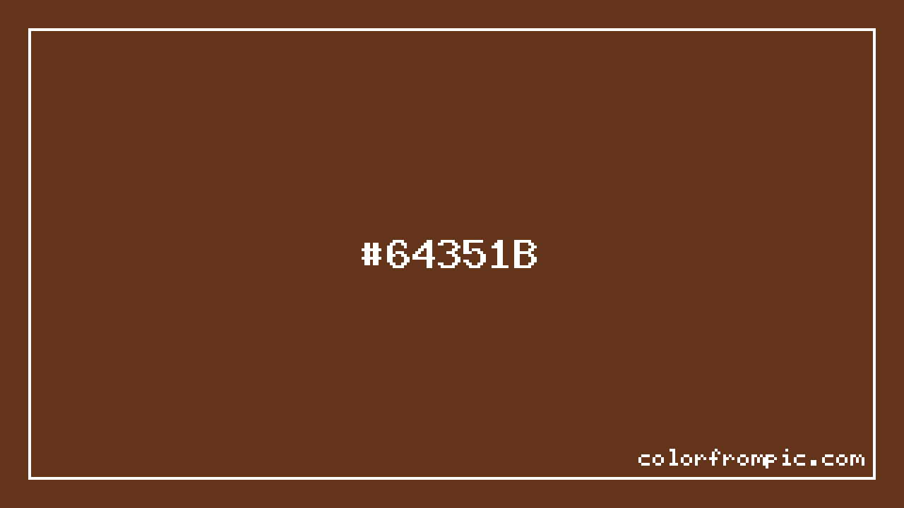 This color works well in various design contexts. As a darker shade, it works well for text, headers, and creating visual weight in compositions. The moderate to low saturation gives this color a sophisticated, muted quality that works well in professional and minimalist designs. When pairing #64351B with other colors, consider its complementary color at hue 201° for maximum contrast, or use analogous colors within 30° of its hue for harmonious combinations. The decimal representation of this color is 6567195, which can be useful in certain programming contexts.