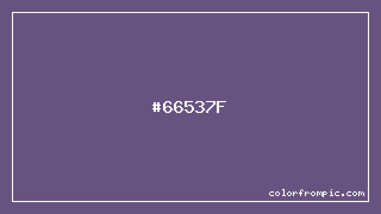 The HEX code for Muted Violet is #66537F. In CSS you can use it directly as color: #66537F; or as a background: background-color: #66537F;. The three-character shorthand is not available for this color since it cannot be reduced without changing the value. Use the full six-character hex for accurate reproduction in any web or design project.