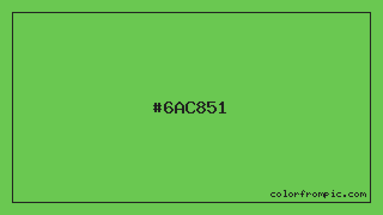 The hexadecimal color code #6AC851 represents a medium shade in the green family. In the RGB color model, this color is composed of 106 red, 200 green, and 81 blue, which translates to approximately 42% red, 78% green, and 32% blue. This makes it a moderately saturated color with cool undertones that can evoke different emotional responses depending on its application.